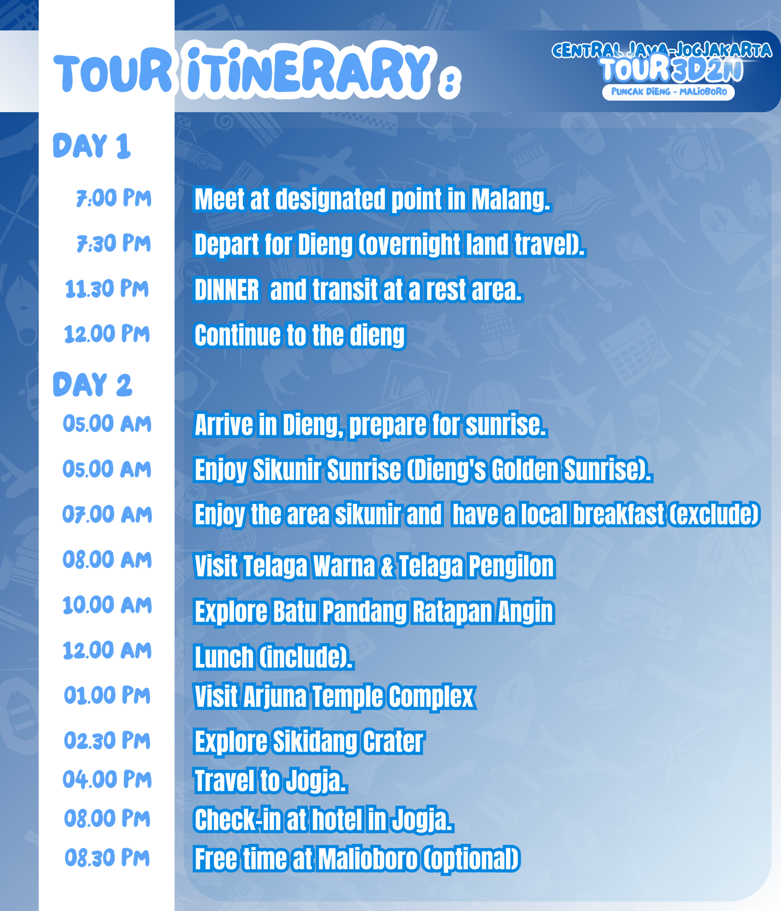 Rasakan pengalaman liburan singkat namun penuh cerita bersama Temantourmu. Paket ini membawa Anda menjelajahi keindahan alam Puncak Dieng, menikmati Golden Sunrise dari Bukit Sikunir, hingga menutup perjalanan dengan suasana khas Malioboro di Yogyakarta.